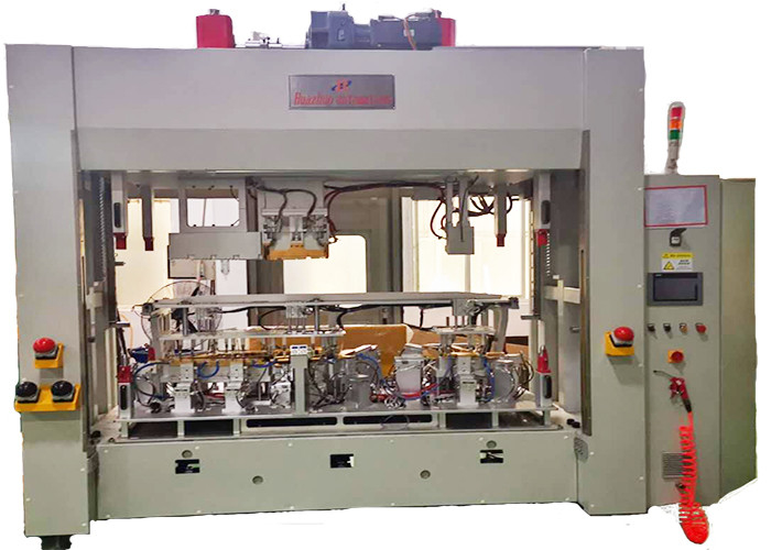 2.The het materiaal heeft een onafhankelijk systeem van de temperatuurcontrole en koelsysteem, dat een constante temperatuur voor lijmactivering kunnen onophoudelijk verstrekken; het lagere dringende apparaat wordt gedreven door een servomotor voor het nauwkeurige plaatsen; de vorm kan snel worden vervangen.